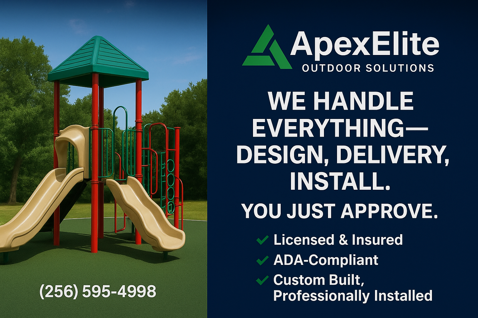 ApexElite Outdoor Solutions is a commercial playground sales and installation company based in Alabama, serving clients throughout Alabama, Georgia, and Tennessee.